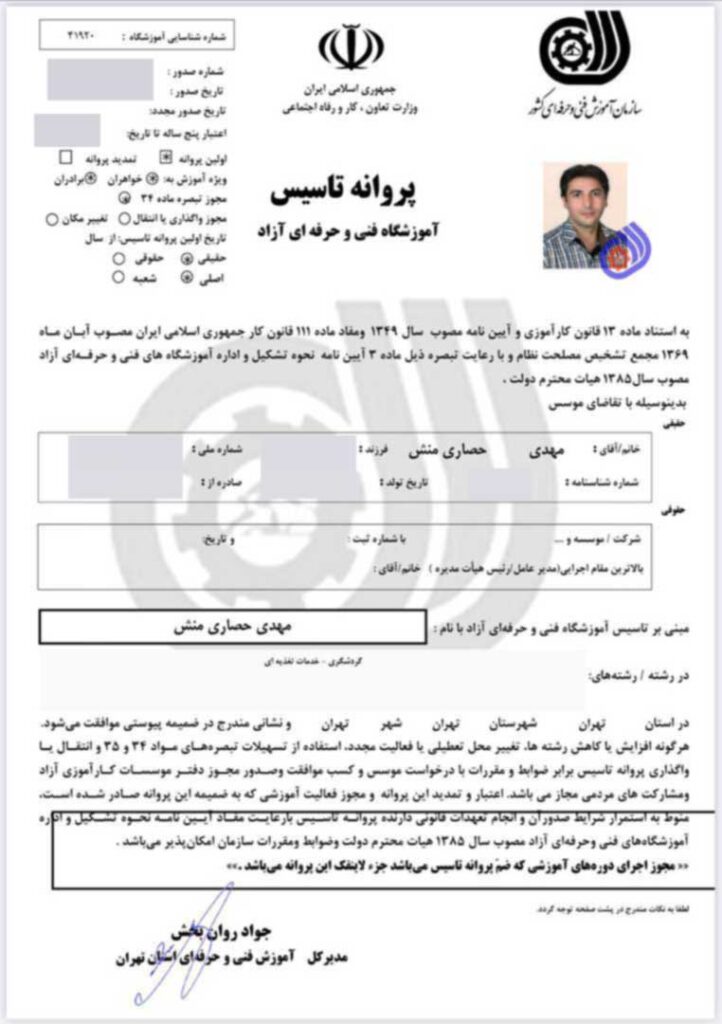پروانه تأسیس رسمی سازمان فنی و حرفه‌ای